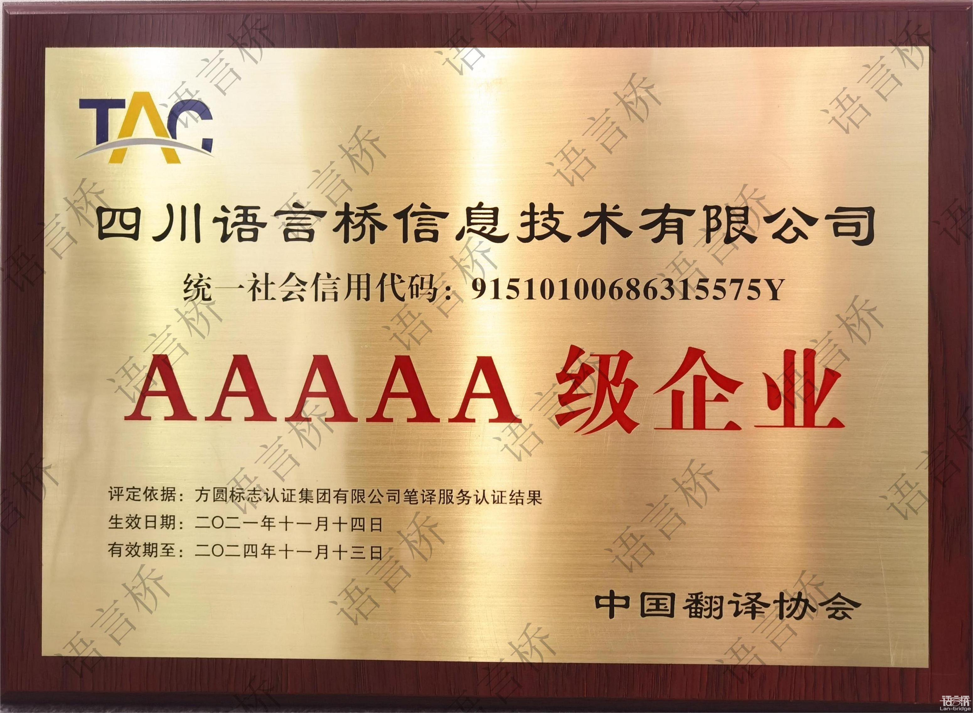 在翻譯服務(wù)企業(yè)認證授牌儀式中,中國翻譯協(xié)會與方圓標志認證集團授予語言橋集團筆譯服務(wù)5A級企業(yè)服務(wù)認證證書,語言橋集團董事長朱憲超出席授牌儀式。這一殊榮也是對語言橋在翻譯服務(wù)、質(zhì)量管理、人才建設(shè)、技術(shù)創(chuàng)新等方面取得的優(yōu)異成績的肯定與認可。