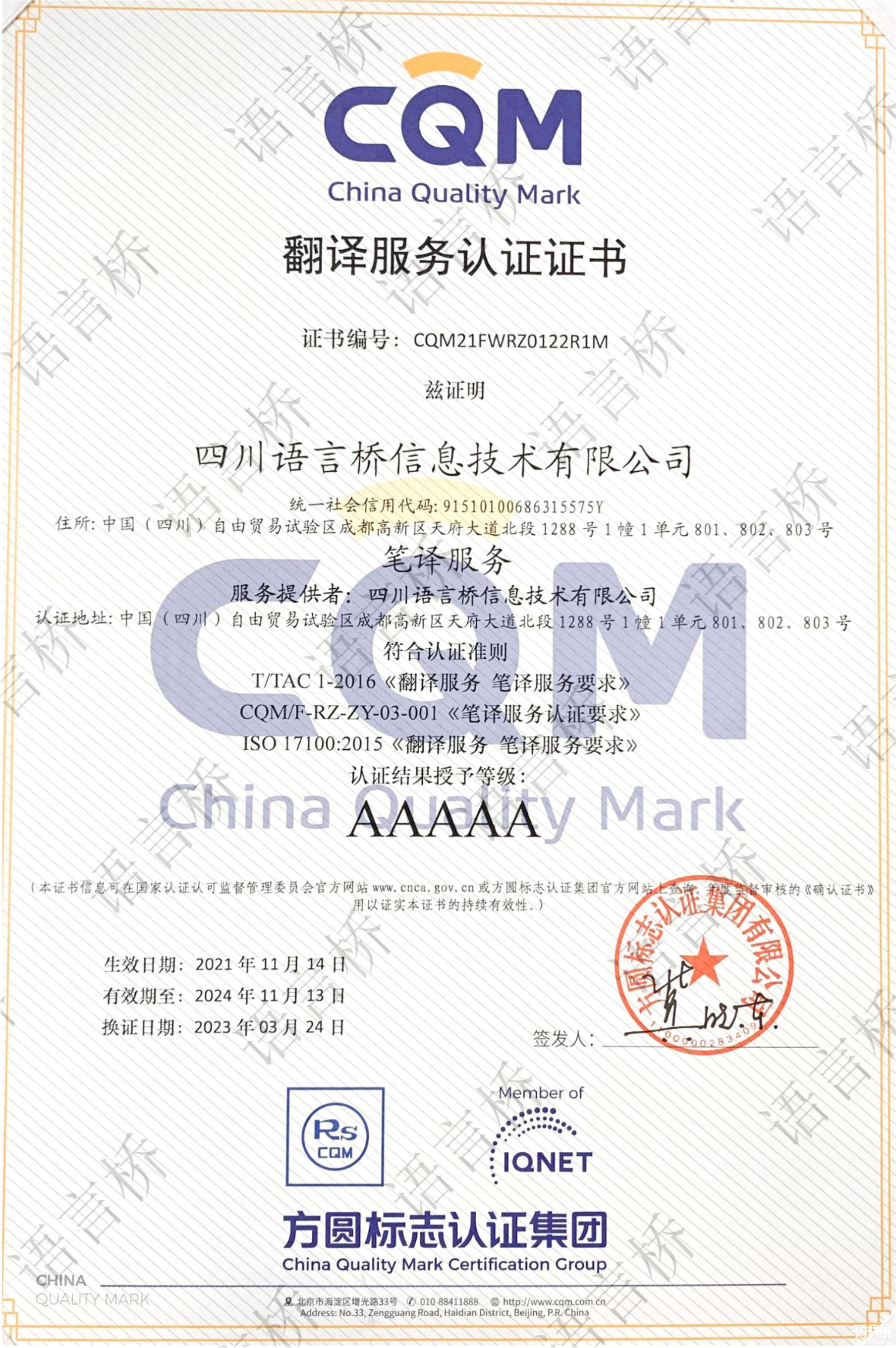 為創(chuàng)新推動翻譯行業(yè)標準化的建設(shè),為創(chuàng)新推動翻譯行業(yè)標準化建設(shè),中國翻譯協(xié)會依托已發(fā)布的標準、行業(yè)規(guī)范,與專業(yè)認證機構(gòu)共同制定了《筆譯服務(wù)認證規(guī)范》,并由第三方認證機構(gòu)方圓標志認證集團對翻譯及語言服務(wù)企業(yè)實施認證工作,通過對翻譯企業(yè)提供的筆譯服務(wù)質(zhì)量管理能力和翻譯服務(wù)水平進行評價,證明翻譯企業(yè)的筆譯翻譯服務(wù)滿足國際標準ISO 17100-2015《翻譯服務(wù) 筆譯服務(wù)要求》、中國譯協(xié)標準T/TAC 1-2016《翻譯服務(wù) 筆譯服務(wù)要求》和方圓標志認證集團有限公司認證規(guī)范CQM/F-ZY-02-001《筆譯服務(wù)要求》的要求,并達到翻譯服務(wù)水平等級(A至AAAAA)。