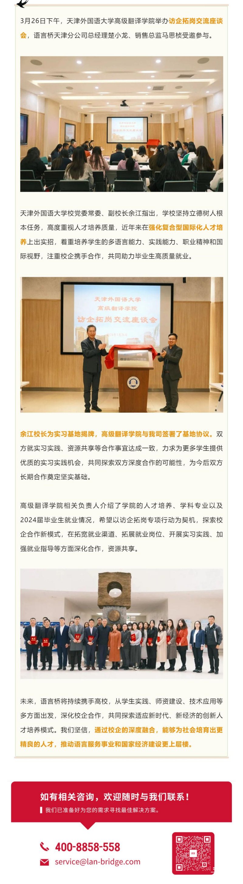 語(yǔ)言橋與天津外國(guó)語(yǔ)大學(xué)高級(jí)翻譯學(xué)院簽約校企合作實(shí)習(xí)基地
