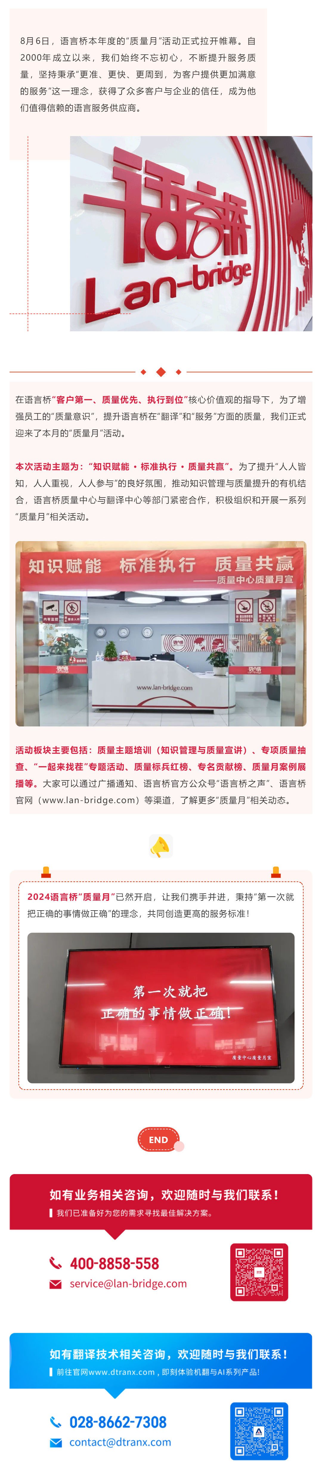 " 2025年7月1日,語言橋“質量月”活動正式拉開帷幕。 自創立以來,歷經二十五載,語言橋始終秉持“更準、更快、更周到”的服務理念,以“參與、透明、可控”的質量方針為"...[查看更多]