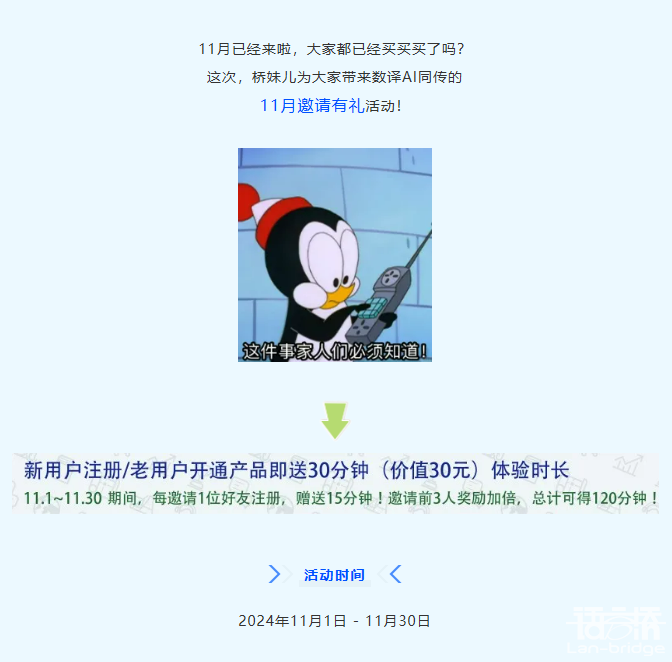 "更多活動(dòng)內(nèi)容請(qǐng)掃碼關(guān)注語(yǔ)言橋之聲公眾號(hào)相關(guān)推送 或直接復(fù)制鏈接地址: https://aitongchuan.dtranx.com 在瀏覽器中打開獲取"...[查看更多]