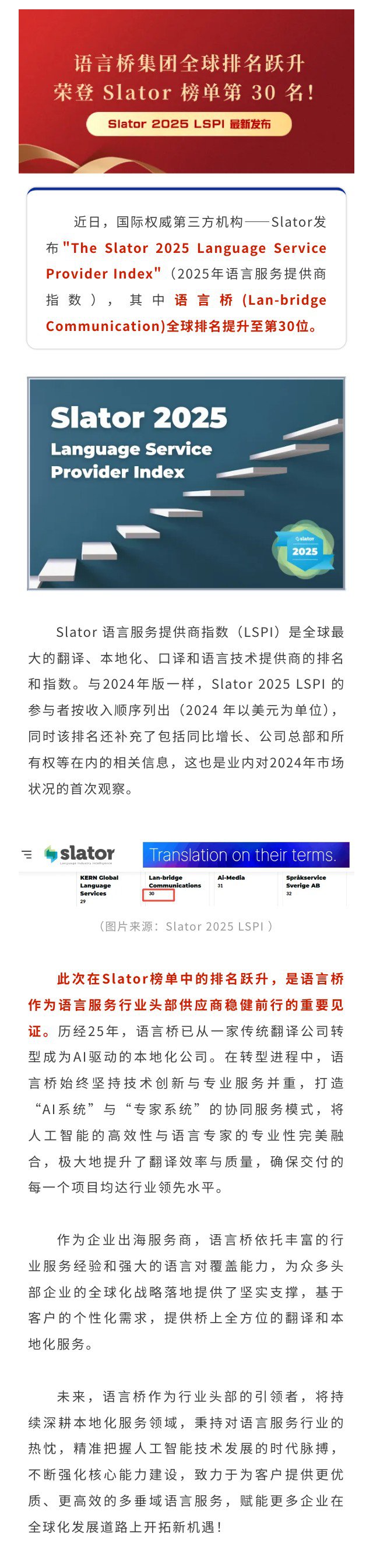 實(shí)力領(lǐng)航!語(yǔ)言橋集團(tuán)榮登 2025 slator 榜單第 30 名!