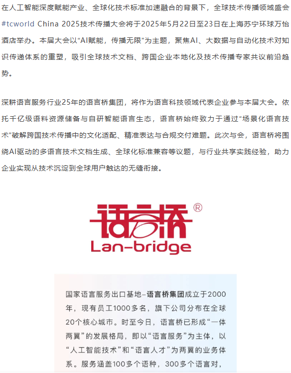 "2025年5月23-24日,全球技術(shù)傳播領(lǐng)域的年度盛會(huì)——tcworld China 2025于中國(guó)上海成功舉辦。本屆大會(huì)聚焦技術(shù)傳播,主要議題包括智能信息、本地化、信息開(kāi)發(fā)、軟件文檔、用戶幫助、內(nèi)容"...[查看更多]