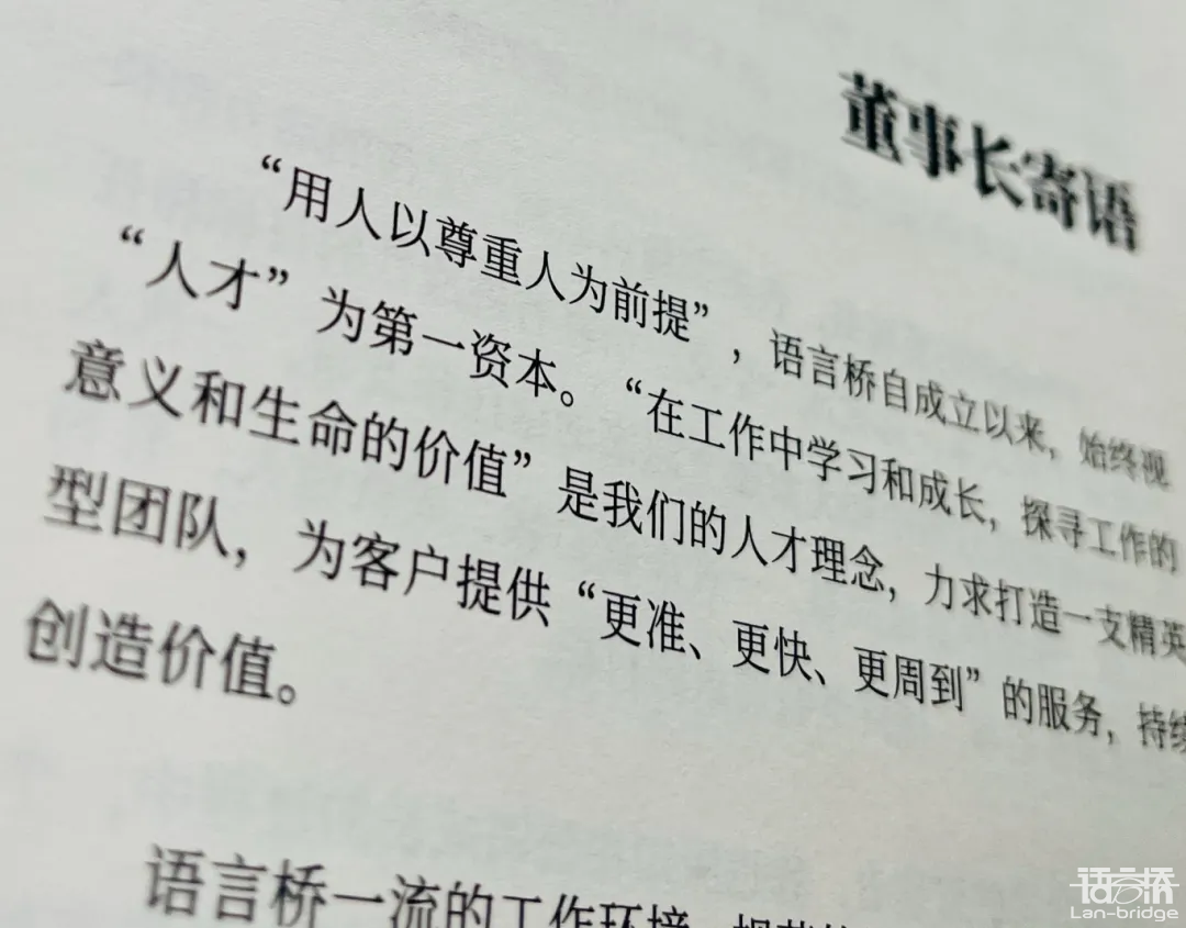 最后還想提一下,語言橋之所以能在翻譯圈里嶄露頭角,除了以上的“自我吹噓”之外,還有一個原因,就是公司的經(jīng)營理念和價值觀。先進(jìn)的經(jīng)營理念和積極向上的價值觀像燈塔一樣指引著大家前進(jìn),我想這是一家企業(yè)想要成為行業(yè)頭部的必要條件。自公司成立之初,就樹立了“把翻譯當(dāng)項目來管理,把公司當(dāng)企業(yè)來經(jīng)營”的理念,并建立了相對規(guī)范的管理和經(jīng)營體系。我記得2003年在沙灣辦公室的墻壁上掛出了“四個一流”的標(biāo)牌,即“營造一流的工作環(huán)境,吸引一流的翻譯人才,提供一流的翻譯服務(wù),成就一流的翻譯企業(yè)”。
