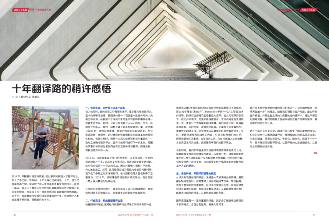 這是她加入翻譯中心的第十年,她說(shuō):”這十年,我親歷了翻譯行業(yè)從傳統(tǒng)經(jīng)營(yíng)模式向現(xiàn)代化服務(wù)產(chǎn)業(yè)的華麗蛻變,是我人生中最為青春寶貴的歲月。“