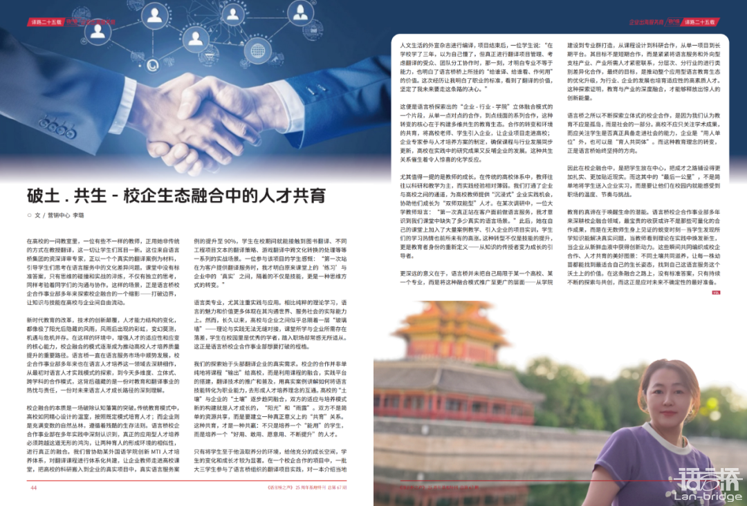 這是她加入營(yíng)銷(xiāo)中心負(fù)責(zé)校企合作的第八年,她說(shuō):“25年來(lái),語(yǔ)言橋一直在語(yǔ)言服務(wù)市場(chǎng)中順勢(shì)發(fā)展,從最初對(duì)語(yǔ)言人才實(shí)踐模式的探索,到今天多維度、立體式、跨學(xué)科的合作模式,這背后蘊(yùn)藏的是一份對(duì)教育和翻譯事業(yè)的熱枕與責(zé)任。”
