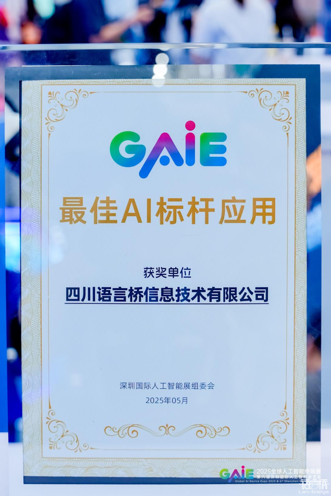 展會期間,語言橋憑借其自主研發(fā)的AI翻譯與多語言處理技術(shù),從數(shù)家參展企業(yè)中脫穎而出,榮獲“最佳AI應(yīng)用獎”。