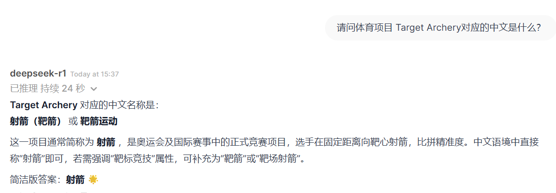 其次,AI 翻譯工具無法提供深入的特定行業(yè)經(jīng)驗(yàn)。比如,筆者在工作中遇到一個(gè)體育方面的術(shù)語target archery,不知道對(duì)應(yīng)的中文是什么便去問DeepSeek。