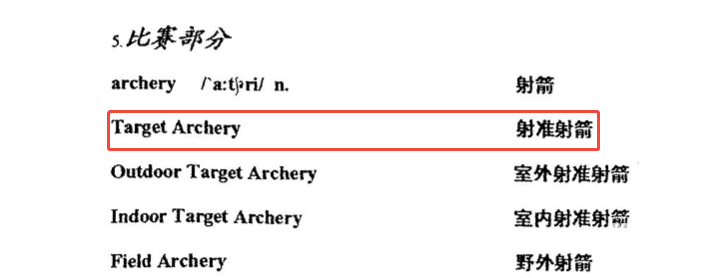 至此,我們可知,target archery這個(gè)體育項(xiàng)目的官方名稱是“射準(zhǔn)射箭”,而不是AI提供的“射箭”或“靶箭”。